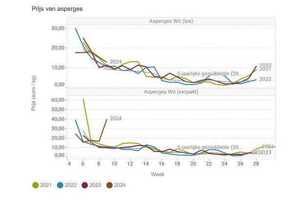 De prijs voor verpakte serre-asperges piekt in week 9. Een ander nicheproduct, de serre-bloemkool, doet het ook goed qua prijs, constateert de tuinbouwconsulent, met een prijs rond 2 euro/stuk.