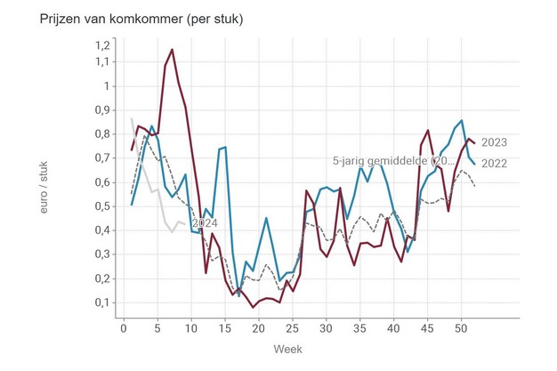 Voor de grote komkommermaten daalde de prijs naar 0,50 euro/stuk, stipt Erika ook in de update aan. De VBT-middenprijs komt uit op 42,7 eurocent en ligt, net als bij tomaat, onder het vijfjarig gemiddelde.