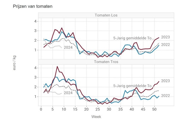 De prijzen worden helaas gedrukt door minder kwalitatief product uit het Zuiden, waar de teelt ten einde loopt, deelt tuinbouwconsulent Erika Buggenhout van Boerenbond. Over week 9 levert dat een middenprijs van 1,376 euro per kilo voor trostomaten op en 1,235 voor losse tomaten.