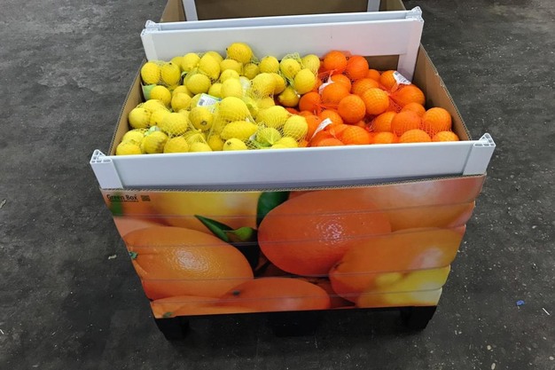 Citrus in het Greenbox-display: De basisafmetingen komen overeen met een halve Europallet en kunnen afhankelijk van de toepassing met verschillende hoogtes, 50, 70 en 100 cm, worden ontworpen.