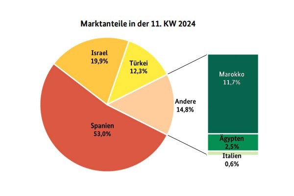 Het einde van het Europees mandarijnenseizoen kwam in zicht in Duitsland: de markten waren nog steeds goed voorzien, de kwaliteit overtuigde nog steeds, maar de vraag nam merkbaar af. Bij lenteachtige temperaturen waren de afzetmogelijkheden beperkt. Spaanse aanvoer, met name Nadorcott en Tango Gold, vormden volgens BLE nog steeds de basis van het aanbod, hoewel de laatste duidelijk minder werden. Orri uit Spanje verdrongen steeds meer het Israëlische product en overtuigden door een goede smaak. Turkse en Marokkaanse aanvoer had slechts een aanvullend karakter en waren op sommige plekken niet meer op de markt. Import uit Egypte en Italië was alleen nog in kleine volumes beschikbaar in Hamburg en München. De prijzen bleven meestal op het niveau van de week ervoor, maar neigden lokaal ook naar beneden.