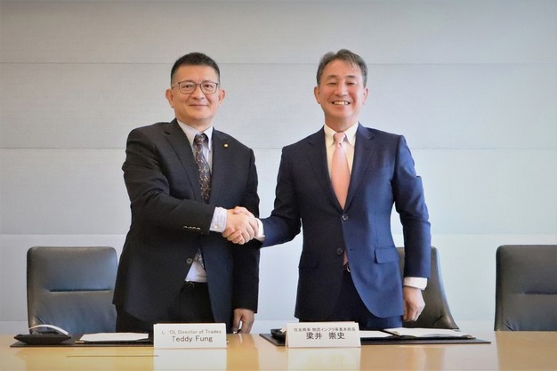 Teddy Fung, directeur handel bij OOCL (links) en Takashi Yanai, algemeen manager logistieke infrastructuur bij Sumitomo Corporation