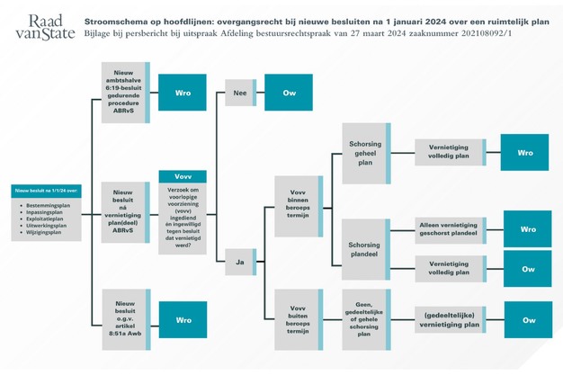 Sinds 1 januari is de Omgevingswet ingevoerd. De Raad van State heeft zich gebogen over de vraag wat te doen met enkele veelvoorkomende scenario's. Een van de belangrijkste conclusies is dat nadat de Afdeling bestuursrechtspraak een bestemmingsplan heeft vernietigd, op een nieuw besluit sinds 1 januari 2024 in veel gevallen de Omgevingswet van toepassing zal zijn.