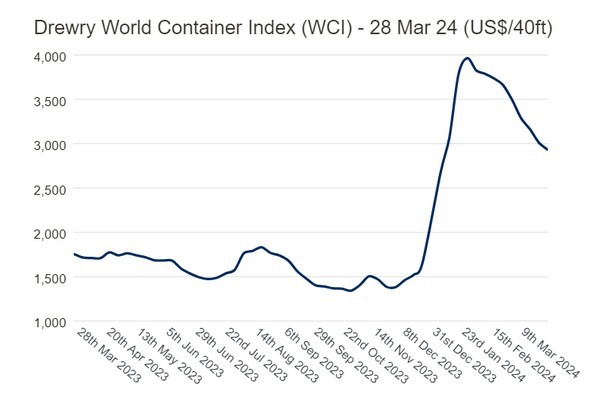 Het gemiddelde van de samengestelde index voor dit jaar tot nu toe is $3.413 per 40ft container, wat $709 hoger is dan het 10-jarig gemiddelde tarief van $2.704 (dat werd beïnvloed door de uitzonderlijke Covid-periode van 2020-22).