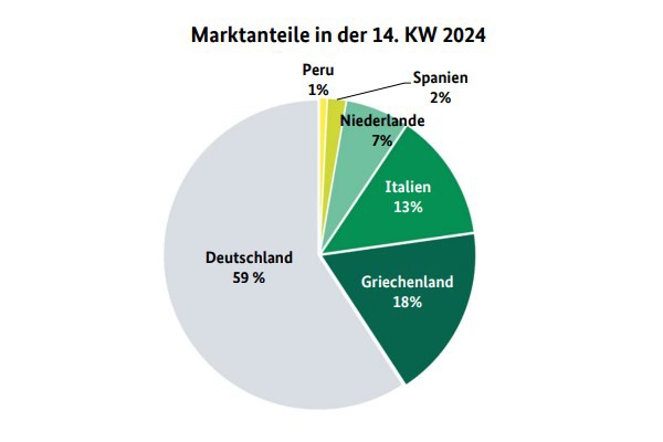 Duits aspergeaanbod nam toe. Bij de witte en paarse producten werd voornamelijk gebruik gemaakt van Griekse, Nederlandse en Italiaanse aanvoer. Bij de groene stengels waren er naast de binnenlandse partijen voornamelijk Spaanse, Italiaanse en Nederlandse. Import uit Mexico en Peru speeld volgens BLE slechts een ondergeschikte rol en had aan belang ingeboet.
