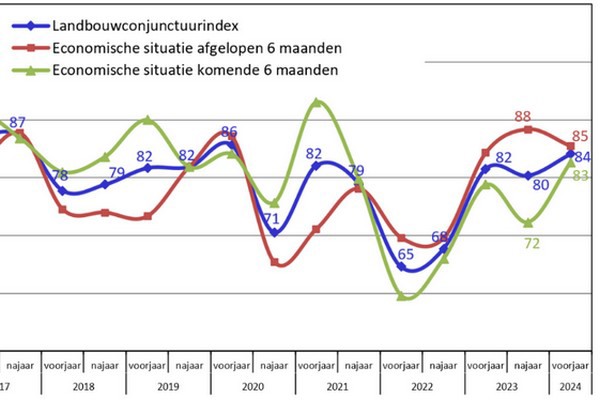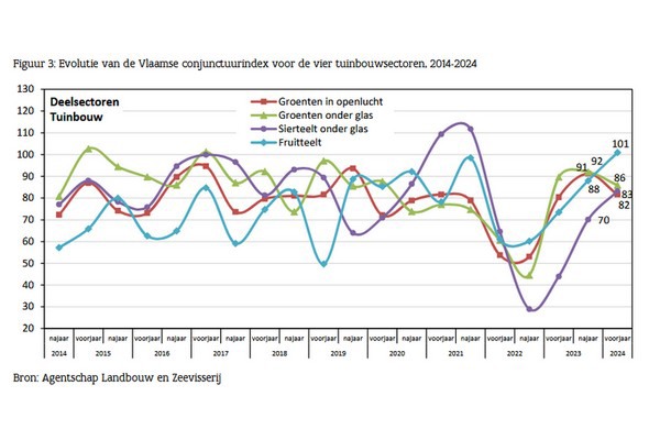 De conjunctuurindex van de Vlaamse land- en tuinbouw stijgt lichtjes in het voorjaar van 2024. Voor groenten onder glas zien de onderzoekers een lichte daling, terwijl in de fruitteelt en de sierteelt de index wel stijgt. Dat blijkt uit de zesmaandelijkse landbouwconjunctuurenquête die het Agentschap Landbouw & Zeevisserij deelt. Als reden voor de dalende index voor groenten onder glas wijzen telers op slechte prijsvorming.