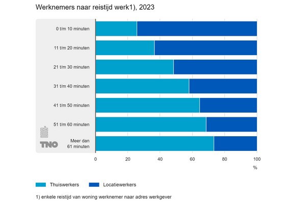 De enkele reistijd van de woning van werknemers naar het vaste adres van hun werkgever was in 2023 naar eigen zeggen gemiddeld 32 minuten. Mensen die thuiswerken zijn, als ze naar hun werk gaan, gemiddeld een kwartier langer onderweg dan werknemers die niet thuiswerken. Het wegvallen van de reistijd of reiskosten is dan ook voor de helft van de thuiswerkers een belangrijke reden om thuis te werken. Dit blijkt uit nieuwe cijfers van de Nationale Enquête Arbeidsomstandigheden (NEA) van TNO en het CBS.