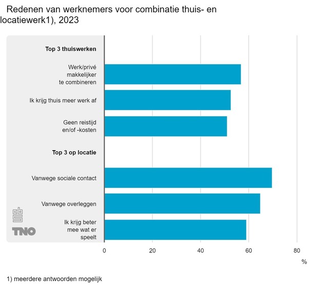 Werknemers die zowel op locatie als thuis werken, is gevraagd naar hun redenen hiervoor. Iets meer dan de helft noemde het wegvallen van reistijd of reiskosten als reden om thuis te werken. Een andere veelgenoemde reden is dat men thuis meer werk af krijgt (53 procent). De meest genoemde reden om thuis te werken is het gemakkelijker kunnen combineren van werk en privé (57 procent). De meest genoemde redenen om juist naar de werklocatie te gaan zijn vanwege het sociale contact (70 procent), vanwege overleggen, en omdat men dan beter meekrijgt wat er op het werk speelt.