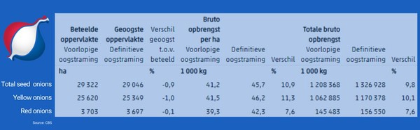 De opbrengst van rode zaaiuien is met 42,3 ton per hectare ook hoger dan vorig seizoen (5,8 procent). Op bijna 4 duizend hectare werden in Nederland rode zaaiuien geteeld, 20 procent lager dan vorig jaar. Er werd in oogstjaar 2023 totaal 157 duizend ton rode zaaiuien geoogst, ruim 20 procent minder dan vorig jaar. De Nederlandse uiensector zet echter wel een kanttekening bij deze forse daling en vermoedt dat gesplitste percelen waarop zowel rode als gele zaaiuien groeien bij de telling worden opgegeven als een volledig perceel gele uien. Dat zou een vertekend beeld geven van het werkelijk geoogste volume rode en gele uien. Van de ongeveer 1,2 miljoen ton gele uien is ongeveer 1,1 miljoen beschikbaar voor de exportmarkt.