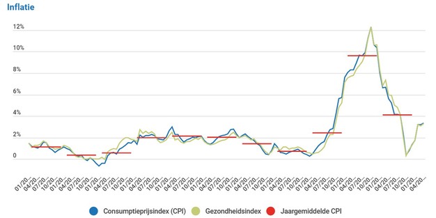 De Belgische inflatie stijgt in april van 3,18% naar 3,37%. De consumptieprijsindex daalt deze maand met 0,63 punt of met 0,48%, zo meldt Statbel. De inflatie voor voeding (inclusief alcoholische dranken) daalt voor de 13e maand op rij en komt deze maand uit op 0,25% tegenover 3,21% in maart. De bijdrage van voeding tot de inflatie bedraagt momenteel 0,06 procentpunt.
