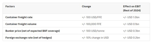 De financiële prestaties voor A.P. Moller - Maersk voor 2024 zijn afhankelijk van verschillende factoren die onderhevig zijn aan onzekerheden, gerelateerd aan onzekere macro-economische omstandigheden, bunkerbrandstofprijzen en vrachttarieven. Als alle andere factoren gelijk blijven, zijn de gevoeligheden voor 2024 voor vier belangrijke aannames hieronder weergegeven: