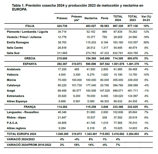 Spanje zal bijna 1,5 miljoen ton perziken, nectarines en paraguayo's oogsten, 1% meer dan in 2023 en 12% meer dan het vijfjarig gemiddelde. Na een zeer slechte oogst in 2022 als gevolg van vorst in Aragón en Catalonië lag de opbrengst in 2023 weer dicht bij het potentieel. Hoewel de droogte in Noord-Spanje deed vrezen voor het voortbestaan van de boomgaarden, bracht regen in mei en juni redding.