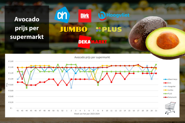 Prijsdata zijn afkomstig van Supermarktscanner.nl en gebaseerd op de online prijzen in de webwinkels van Albert Heijn, Jumbo, Plus, DekaMarkt, Dirk en Hoogvliet. De prijs is een gemiddelde, inclusief de promoties. In deze prijsvergelijking zijn herkomst en kwaliteit niet meegenomen. De meeste supermarkten vermelden deze gegevens niet op hun website, Hoogvliet en Jumbo vermelden het land van herkomst. Mogelijk worden in de bovenstaande prijsvergelijking onrijpe avocado's met rijpe vergeleken en Spaanse komkommers met Hollandse.