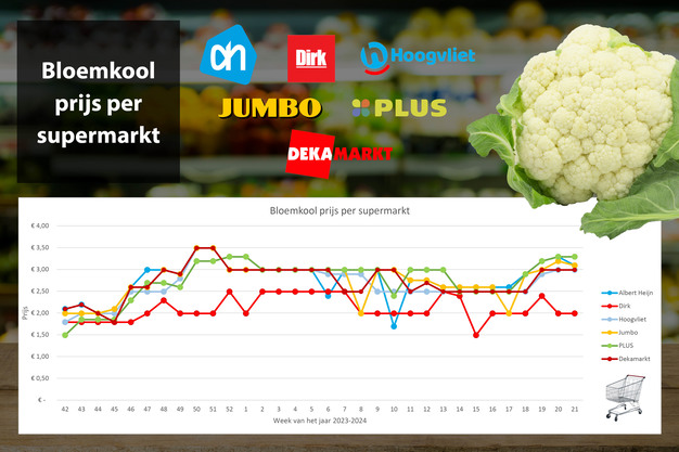 Albert Heijn en Jumbo verlagen de bloemkoolprijs in week 21, waardoor deze in beide supermarkten nu 3,09 euro per stuk kost. Plus houdt de prijs op 3,29 per stuk. Dirk is met 1,99 euro per stuk nog altijd flink goedkoper. Hoogvliet en DekaMarkt houden de prijs net onder de 3 euro.