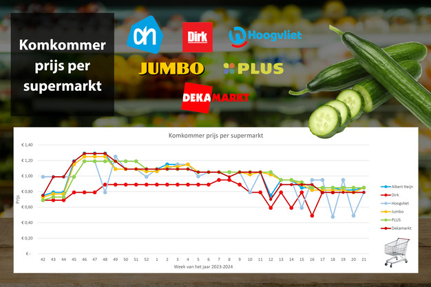 De vaste komkommerprijzen bij Albert Heijn en Jumbo bewegen omhoog in week 21, Hoogvliet verlaagt de vaste prijs juist met 16 cent naar 0,79 euro. Daarmee ligt de prijs van de fullservice supers AH, Jumbo en Plus op 0,85 cent per komkommer, bij de andere supermarkten kost een komkommer 0,79 cent.