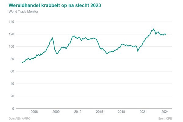 De terugval in de vraag leidde in 2023 volgens het Centraal Planbureau (CPB) tot een daling van de wereldhandel met maar liefst 2 procent. Voor 2024 verwacht ABN AMRO een herstel van de wereldhandel van 1,8 procent, en in 2025 van zelfs 2,6 procent. Vooral het internationale transport zal daarvan profiteren. Begin dit jaar zette de wereldhandel al een voorzichtig herstel in. De luchtvracht profiteerde daar al van, met over de periode januari en februari in Nederland een stijging van het volume van 9,8 procent (bron: CBS). Mogelijk heeft de luchtvracht geprofiteerd van de ontregeling van de zeevaart door de aanslagen op schepen door de Houthi-rebellen in Jemen, waardoor veel schepen omvaren rond de Kaap de Goede Hoop. De containervolumes zaten in het eerste kwartaal echter eveneens in de lift, met een stijging van 3,3 procent in de Rotterdamse haven. Het lijkt er dus op dat de ontregeling door aanslagen op de Rode Zee slechts marginale invloed op het goederenvervoer heeft.