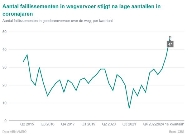 Intussen stijgen de loonkosten snel door het tekort aan chauffeurs en de nieuwe cao, die zorgt voor een stijging van de loonkosten met in totaal circa 10 procent in de periode 2024-2025. Mede door de zwakke markt en de vereiste aflossing van coronaschulden is het aantal faillissementen in het wegvervoer gestegen, vooral in het eerste kwartaal van dit jaar.