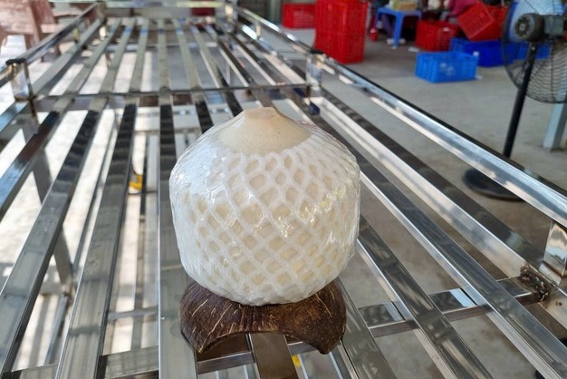 "De selectie van kokosnoten is uiterst belangrijk en vereist professionele technici om de beste kokosnoten uit te kiezen. Als de kokosnoten niet zorgvuldig worden geselecteerd, is er een groot risico op barsten tijdens het snijden en kraken. We kiezen alleen kokosnoten die voldoen aan de exportstandaarden."