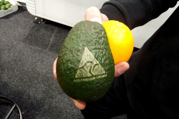 "We proberen dit om van die vervelende stickers af te komen," vertelt Lachlan Templeton van Result Group. "Het is een alternatieve manier om QR-codes, een merklogo of de bedrijfsnaam op fruit te krijgen. De naam kan niet meer verwijderd worden en het is milieuvriendelijk. Het is goedkoop en er kunnen kosten mee bespaard worden, omdat er geen labels en papier meer nodig zijn."