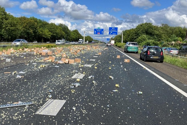 Op de A58 Roosendaal richting Breda heeft een vrachtwagen dinsdagmiddag een lading ananasconserven verloren, zo meldt Rijkswaterstaat. De lading bestond uit ananas in blik. Dit lag nu over de 2 rijstroken bij Rucphen. Verkeer werd via de vluchtstrook om het verloren fruit geleid. Tussen Roosendaal en Rucphen had je een half uur vertraging. Rijkswaterstaat kon de weg even na 19.00 uur weer vrijgeven.
