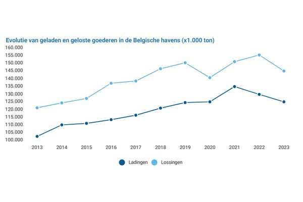 De hoeveelheid geladen goederen is met 3,7% gedaald ten opzichte van 2022. Tegenover 2013 is dat een stijging van 21,5%.