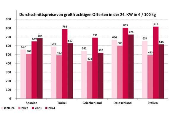 Volgens de BLE domineerden de Spaanse kersen de Duitse markt. Ze speelden vooral een belangrijke rol in Berlijn, waar kersen met een grootte van 32 mm+ ongeveer €8 per kg kostte. In Hamburg en Keulen was hun aanwezigheid merkbaar toegenomen, waardoor ze goedkoper waren. In Frankfurt was de kwaliteit niet helemaal overtuigend en daarom wendden de klanten zich steeds meer tot de Turkse import. Deze arriveerden in grotere aantallen in München, waardoor de prijzen een beetje daalden en ze populair waren bij kopers ondanks de relatief hoge waarderingen. In Berlijn waren Napoleon en Sahili grotendeels bedoeld voor de retail. Griekse en Italiaanse leveringen vulden het aanbod aan, maar lieten af en toe wat te wensen over op het gebied van kwaliteit. Binnenlandse kersen waren schaars en iets duurder. Over het algemeen was de beschikbaarheid enigszins beperkt. Desondanks kon over het algemeen aan de vraag worden voldaan. Kleine kersen werden vaak genegeerd door klanten, terwijl grotere maten gewilder waren. De prijzen schommelden vaak, maar gingen over het algemeen eerder omlaag dan omhoog.