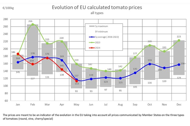 De tomatenprijzen lagen in Nederland lager dan in mei vorig jaar, maar wel hoger dan het vijfjarig gemiddelde. Voor Italiƫ en Spanje geldt dat de prijzen hier afgelopen maand wel fors achterbleven op dat prijsgemiddelde over de afgelopen vijf jaar. Over de hele linie lagen de tomatenprijzen in Europa in mei nipt onder het vijfjarig gemiddelde met een gemiddelde kiloprijs van 1,13 euro, zo blijkt uit een update van het tomatendashboard van de Europese Commissie.