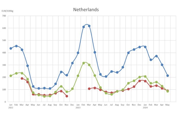 Vooral de prijs voor cherry- en specialtytomaten in Nederland springt eruit op het dashboard. Ruim 2,13 euro per kilo is wel 5% lager dan in mei 2023, maar ook 97% hoger dan het vijfjarig gemiddelde. De populariteit van het segment wordt in de markt ook onderkend. Op het Global Tomato Congress afgelopen maand in Den Haag spraken diverse sprekers de verwachting uit dat er nog meer groei mogelijk is in dit segment.