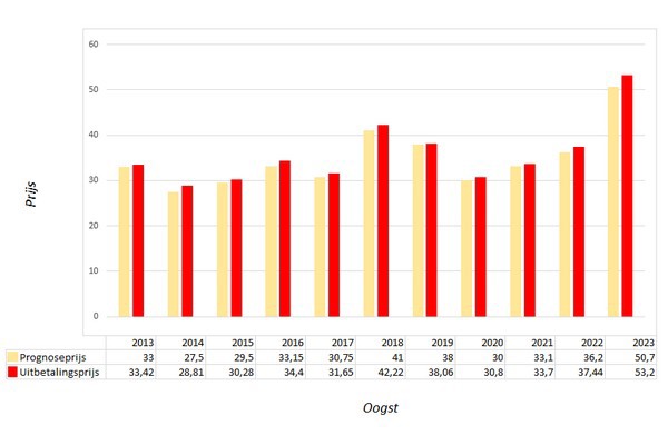 De uitbetalingsprijs voor pootgoedtelers van HZPC Holland voor de oogst van 2023 is €53,20 per 100 kilo. Een prijs die ruim 40% hoger is dan de uitbetalingsprijs van oogst 2022 en 5% hoger dan de in maart gepubliceerde prognoseprijs. Naast de hoge uitbetalingsprijs, kenmerkt oogstjaar 2023 zich vooral ook door uitdagende omstandigheden en lagere opbrengsten.