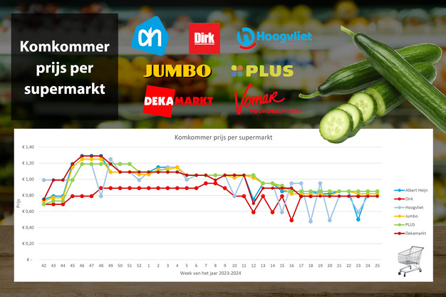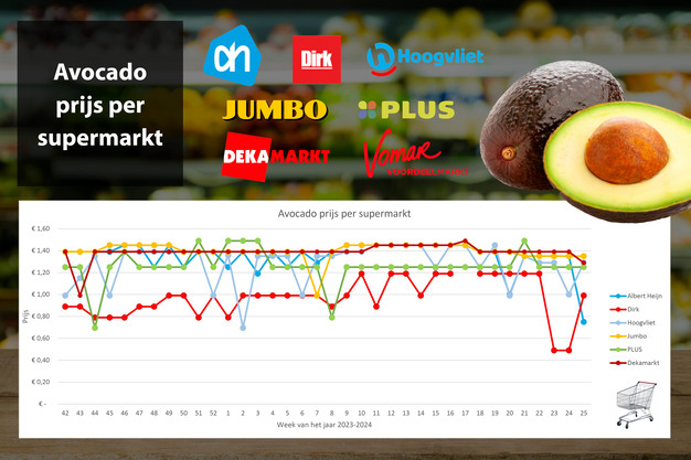 Prijsdata zijn afkomstig van Supermarktscanner.nl en gebaseerd op de online prijzen in de webwinkels van Albert Heijn, Jumbo, Plus, DekaMarkt, Dirk en Hoogvliet. De prijs is een gemiddelde, inclusief de promoties. In deze prijsvergelijking zijn herkomst en kwaliteit niet meegenomen. De meeste supermarkten vermelden deze gegevens niet op hun website, Hoogvliet en Jumbo vermelden het land van herkomst. Mogelijk worden in de bovenstaande prijsvergelijking onrijpe avocado's met rijpe vergeleken en Spaanse komkommers met Hollandse.