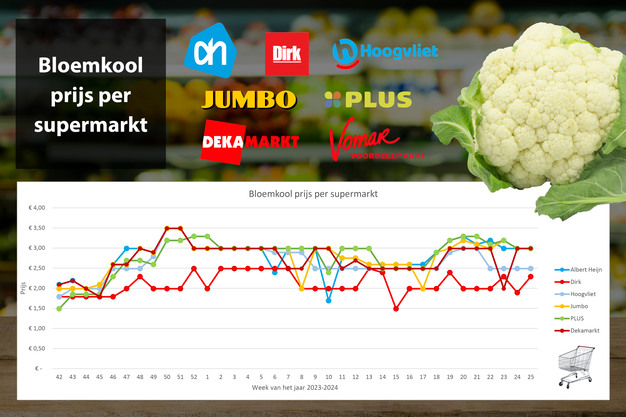 De meeste formules blijven het eens over de bloemkoolprijs. Albert Heijn, Jumbo, Plus, Dekamarkt en Vomar stellen de prijs op 2,99 euro per stuk. Hoogvliet houdt 2,49 euro aan en Dirk blijft met 2,29 flink goedkoper.
