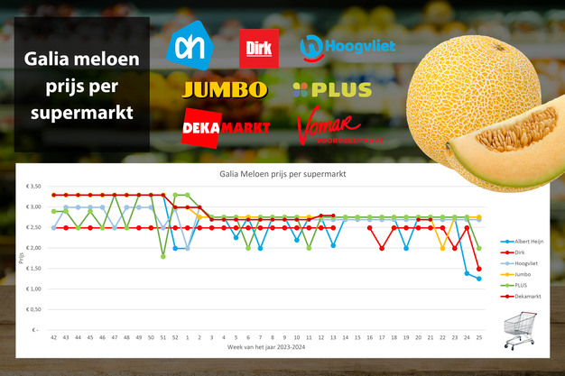 Een prijsverlaging bij Albert Heijn en aanbiedingen in Galia. AH verlaagt in week 25 de vaste prijs met 26 cent en ligt daarmee gelijk aan die van Dirk (2,49 euro per stuk). In aanbiedingen overtreft AH, de marktleider geeft 50% korting, Dirk haalde 1 euro van de prijs af, ook Plus had een aanbieding. Bij DekaMarkt is Galia al een tijdje niet beschikbaar in het online assortiment en ook Vomar heeft al twee weken geen Galia.