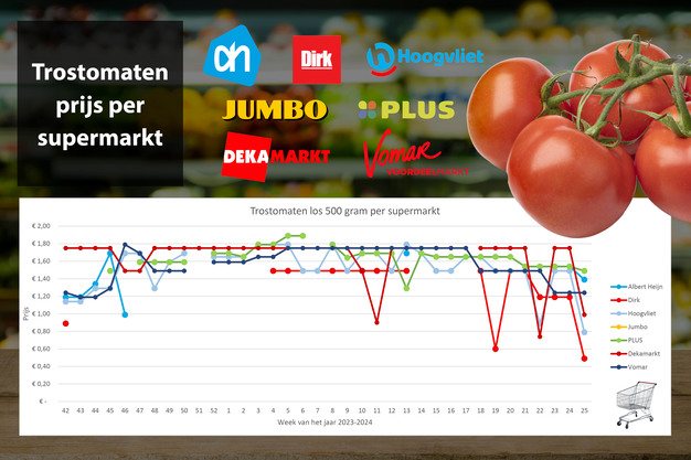 Daarentegen bewegen formules sterk in trostomaten (500 gram), in week 25 flinke aanbiedingen bij Dirk, Hoogvliet en DekaMarkt. AH verlaagt de vaste prijs naar 1, 39 euro en Plus naar 1,49 euro. De prijzen bij Dirk en Vomar blijven met respectievelijk 1,19 en 1,24 euro het laagste.