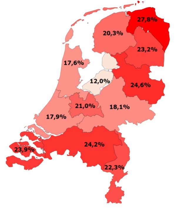 Figuur 2: Geografische representatie van de wintersterfte op provinciaal niveau. Flevoland had gemiddeld genomen het kleinste wintersterftepercentage (12%) en Groningen het grootste (27,8%).