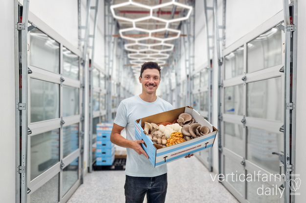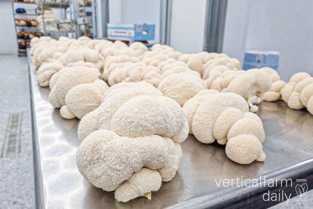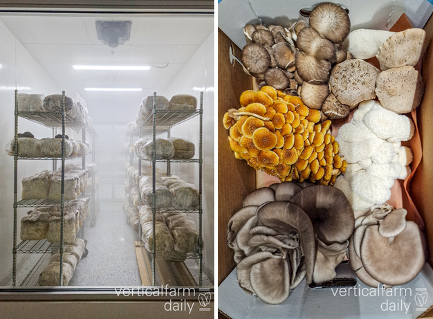 Een van de teeltruimtes en een close-up van paddenstoelen die klaar zijn voor levering op dezelfde dag