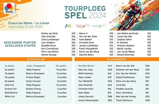 De bergen waren nog niet heel hoog, maar wel flink steil en dus zag geletruidrager Tadej Pogačar kans zijn concurrenten maar weer eens aan te vallen. Gisteren niet helemaal met succes, want Jonas Vingegaard kon uiteindelijk terugkomen en zelfs winnen. Het levert Stefan van Driel de dagzege in het Takii Tourploegspel op, al helpen vooral ook de punten voor Guilio Ciccone mee.