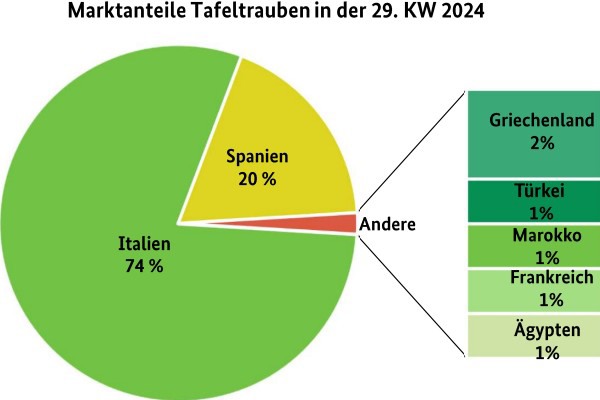 Ondertussen diversifieerde het Europese druivenaanbod, met een groot aantal variëteiten uit Italië en Spanje. De Italiaanse Victoria en Black Magic voerden de boventoon, gevolgd door Sugra en Arra. Volgens de BLE was er nog steeds veel vraag naar de lichtgekleurde en rode pitloze variëteiten, waarvan de meeste tussen 3,60 en 4,40 euro per kilo kosten en indruk maakten op klanten met hun onberispelijke uiterlijk en heerlijke smaak. Met de rode Red Globe had Italië een nieuw ras in haar programma. In Frankfurt startte de blauwe Prima uit Frankrijk het nieuwe seizoen in kartons van 5 kg tegen relatief gunstige prijzen van 20 tot 24 euro. In Berlijn was de Italiaanse Michele Palieri opnieuw verkrijgbaar. Met een markt die over het algemeen vrij goed gevuld was, waren prijsverlagingen moeilijk te vermijden, hoewel het zomerweer en de bijbehorende omzet positief waren. De Italiaanse Crimson Seedless en Italia worden volgende week verwacht.
