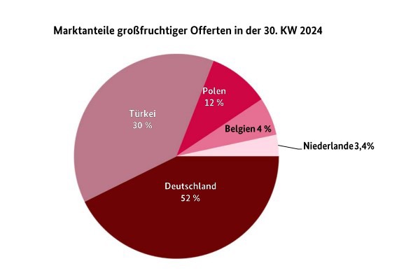 Het Duitse kersenseizoen ging de laatste rechte lijn in: de beschikbaarheid was duidelijk beperkt. Binnenlands fruit overheerste nog steeds, maar was in sommige gevallen al van de markt verdwenen. De kwaliteit was over het algemeen overtuigend. Producten van hoge kwaliteit en van groot kaliber waren vaak schaars, waardoor ze duurder werden; de prijzen stegen soms sterk. Turkse Napoleon volgde het binnenlandse aanbod qua hoeveelheid. Qua smaakeigenschappen lieten ze op sommige plaatsen te wensen over: Hun conditie verzwakte zienderogen. De verkopers werden daarom gedwongen om af en toe concessies te doen. Poolse, Belgische en Nederlandse zendingen speelden slechts een ondergeschikte rol. Ze werden in sommige gevallen duurder, omdat aan de vraag op de markten niet consequent kon worden voldaan met Duitse zendingen. Over het algemeen was de vraag aan het einde van het seizoen nog steeds gunstig te noemen.