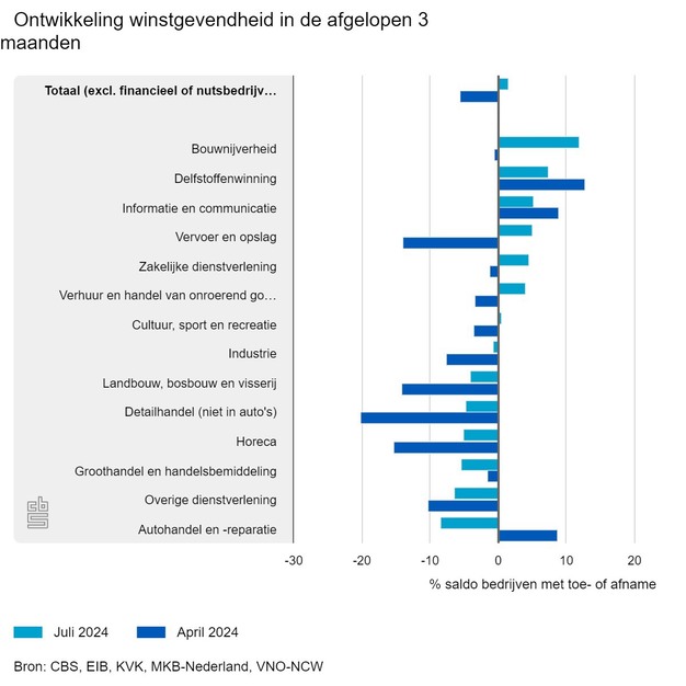 Gecorrigeerd voor seizoeneffecten zijn er iets meer ondernemers waarbij de winstgevendheid is verbeterd dan verslechterd in het tweede kwartaal. Tussen de bedrijfstakken zijn echter grote verschillen. In de bouwnijverheid zijn ondernemers het positiefst en geeft per saldo bijna 12 procent aan dat de winstgevendheid is verbeterd. In de autohandel en -reparatie is het saldo van positief (bijna 9 procent) omgeslagen naar het meest negatief van alle bedrijfstakken (ruim -8 procent). In de bedrijfstak vervoer en opslag sloeg het negatieve saldo juist om naar positief en dit nam ook het sterkst toe.