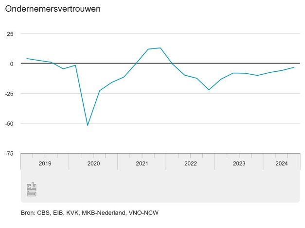 In het tweede kwartaal is de winstgevendheid volgens ondernemers voor het eerst in ruim twee jaar per saldo verbeterd. In veel bedrijfstakken zagen ondernemers de winstgevendheid nog wel afnemen. Het ondernemersvertrouwen is gestegen, maar blijft nog licht negatief, en komt aan het begin van het derde kwartaal van 2024 uit op -3,4. Dit melden het CBS, KVK, het Economisch Instituut voor de Bouw, MKB-Nederland en VNO-NCW op basis van de Conjunctuurenquête Nederland die in juli is gehouden.