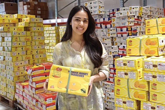Sharon Jeer is de dochter van het oprichtersechtpaar en is al enkele jaren verantwoordelijk voor de webshop voor eindgebruikers en particuliere klanten genaamd JJGT. Op de foto: Sindhri mango's uit Pakistan worden verkocht onder het huismerk.