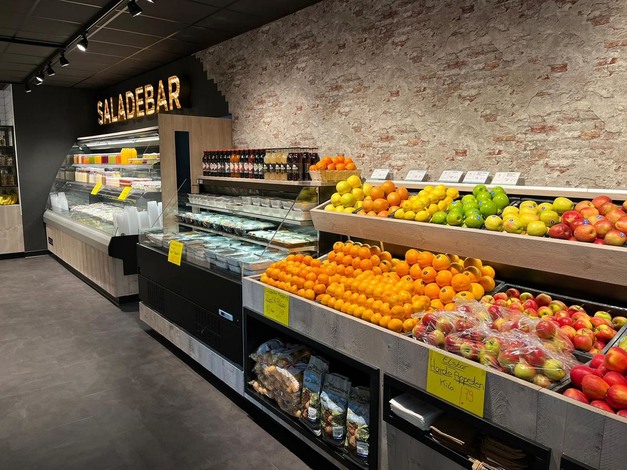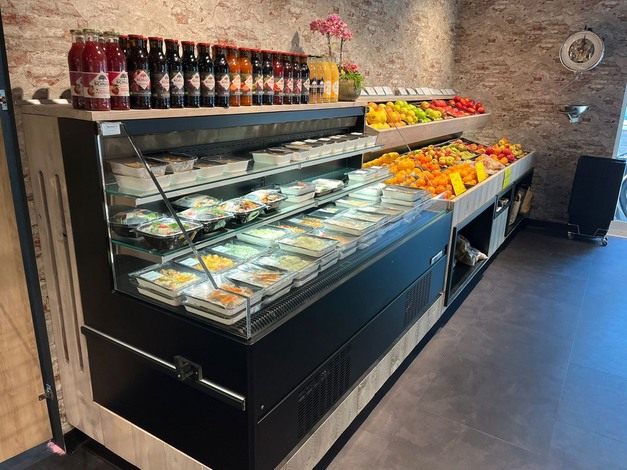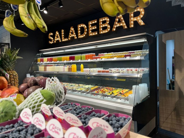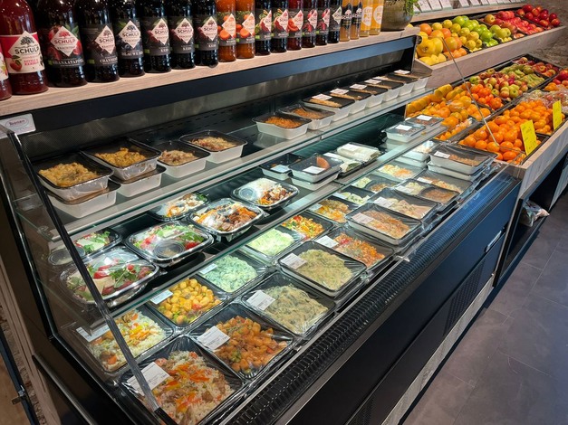 Een ruim assortiment kant-en-klare maaltijden, rauwkosten, salades, desserts, vruchtensappen en zuivel worden fraai gepresenteerd in de koelmeubelen