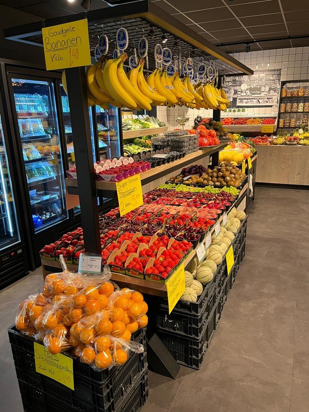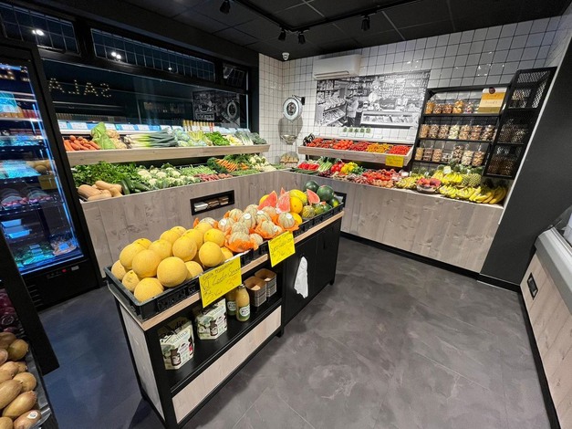 Voor de presentatie van de onbewerkte groenten en fruit is gekozen voor een twee-laags AGF-stelling type Waterval met in de onderbouw ruimte voor de voorverpakte aardappelen. Het geheel is fraai uitgelicht met LED-verlichtingsarmaturen geplaatst op spanningrails.