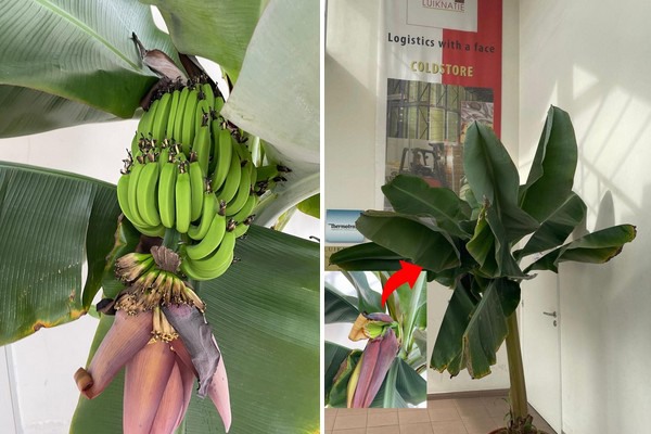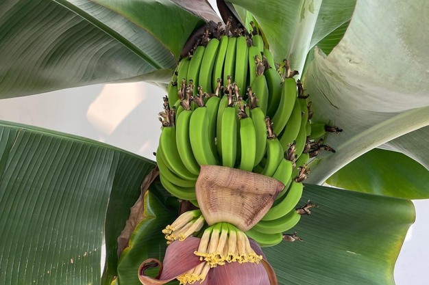 "Tot we begonnen te merken dat hij steeds meer bladeren aan begon te maken. Het ging maar door", vertelt hij. "En op een gegeven moment liep een van onze medewerkers langs en die zag dat het niet enkel meer bladeren waren, maar ook iets anders. Een soort bruin/bordeaux kleurige 'vrucht'. Deze begon na verloop van tijd als een bloem open te gaan en daaronder vonden we dus daadwerkelijk bananen. Daar hebben we toch wel even om moeten lachen. Steven (red. Beuselinck) heeft vervolgens een contact erbij gehaald en gevraagd of we ze ooit konden plukken. Die stelde dat we tussen de 85 en 110 dagen geduld moesten hebben en dat we ze dan zouden moeten kunnen plukken."