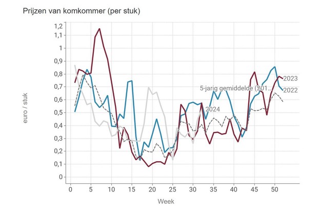 De komkommerprijs is de afgelopen twee weken tijdens het mooie weer wel opgeklommen, na eind juni en begin juli nog tot onder het vijfjarig gemiddelde te zijn gezakt. In week 32 komt de gemiddelde stuksprijs bij de veilingen van het Verbond van Belgische Tuinbouwcoöperaties uit op 52,4 eurocent per stuk.