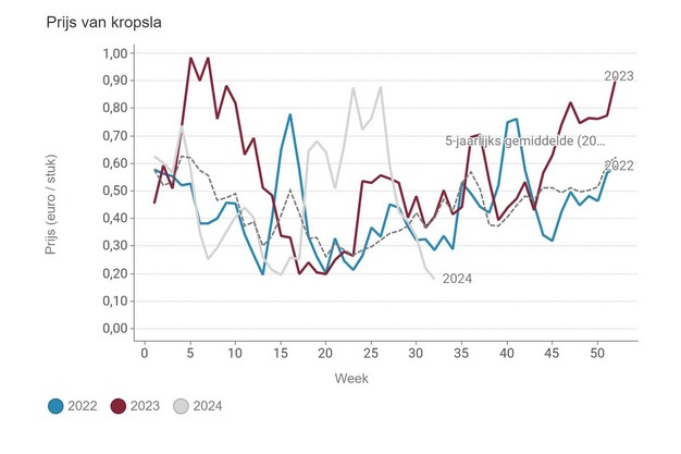 De middenprijs voor kropsla profiteert niet van het warme zomerweer. Vanaf week 26 is de prijs aan het zakken, inmiddels tot een gemiddelde stuksprijs van nog maar 18 cent per krop.