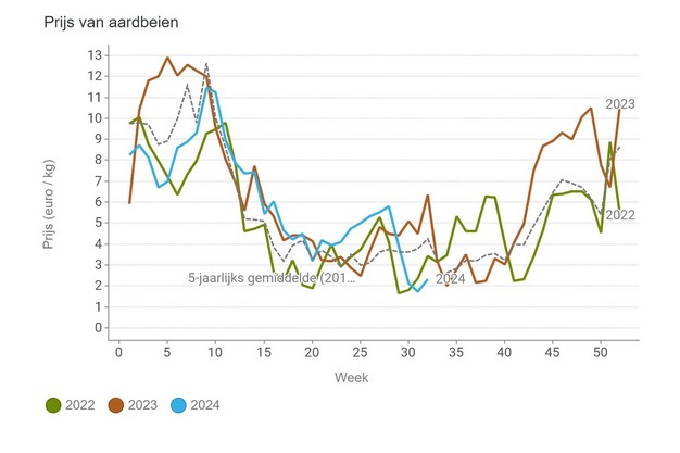 De aardbeienprijs is iets opgeveerd tot 2,34 euro per kilo.