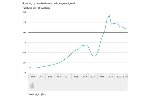 Het aantal vacatures nam in het tweede kwartaal van 2024 af met 10 duizend en het aantal werklozen daalde licht, met 3 duizend. De arbeidsmarkt werd hierdoor iets minder krap. Met 108 vacatures per 100 werklozen is de spanning echter nog steeds hoog. Het aantal banen nam opnieuw toe (+22 duizend). Dat blijkt uit nieuwe cijfers van het CBS.