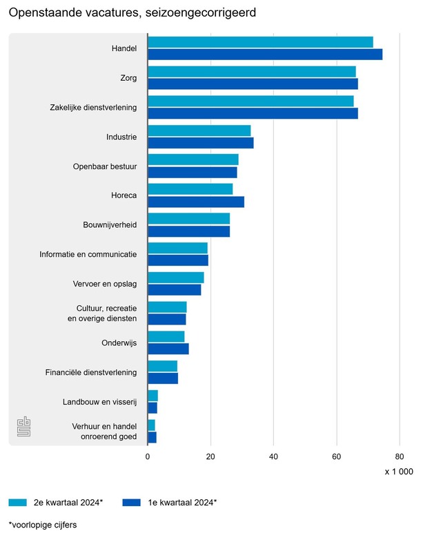 Het aantal vacatures daalt nu twee jaar vrijwel onafgebroken, alleen in het eerste kwartaal van 2024 was nog een lichte toename. Aan het einde van het tweede kwartaal stonden er 401 duizend vacatures open. De meeste vacatures zijn in de handel, de zakelijke dienstverlening en de zorg. Gezamenlijk zijn deze drie bedrijfstakken goed voor de helft van alle openstaande vacatures.
