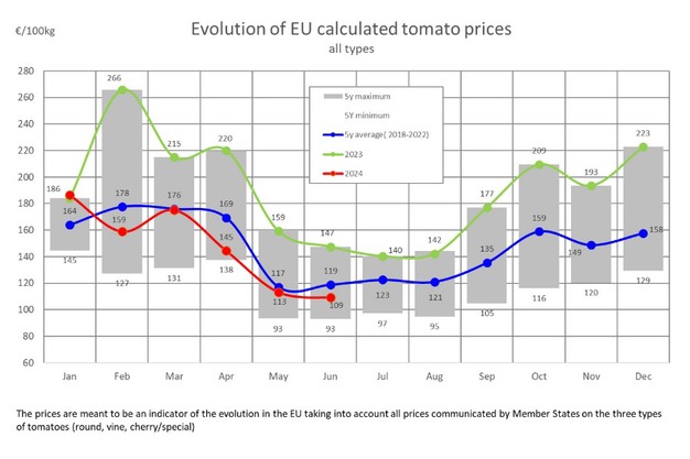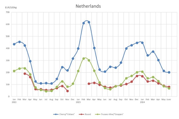 Voor zowel Spanje, Italië als Frankrijk lagen de prijzen in juni wel onder het vijfjarig gemiddelde, variërend van 3% lagere prijzen voor Spaanse ronde tomaten tot 31% lagere prijzen dan gemiddeld voor Franse cherry- en specialtytomaten.